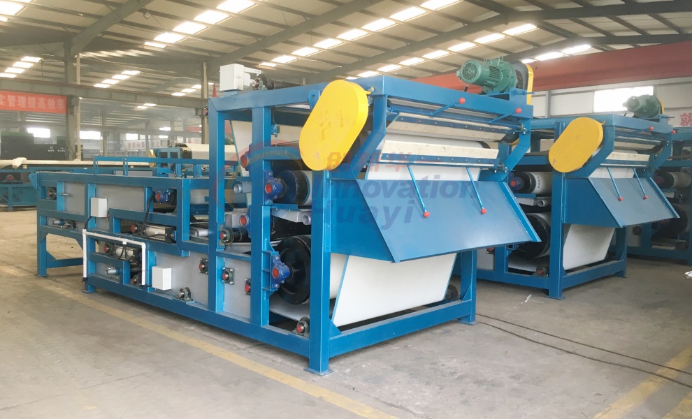 漿料經(jīng)布漿器均勻地分布在上網(wǎng)預(yù)脫水區(qū),后進(jìn)入重力脫水區(qū)。污泥在該區(qū)域內(nèi)主要靠自身的重力作用脫去大部分水份,使?jié){料失去流動(dòng)性,脫水濃度提至3-5%。然后在中網(wǎng)上面繼續(xù)脫水,漿料進(jìn)入由中、下網(wǎng)形成的楔形交匯區(qū),即壓力脫水區(qū)。漿料在該區(qū)域受到中、下濾網(wǎng)的輕度擠壓,脫水至15-20%左右,然后進(jìn)入加壓脫水區(qū)。壓力脫水區(qū)由8個(gè)不同直徑的脫水輥,使濾網(wǎng)的兩面在擠壓過(guò)程中迅速脫水。脫水壓輥的直徑由大逐漸變小的排列及濾網(wǎng)包角的改變,確保形成不斷增大的脫水壓力及相應(yīng)的剪切力,使?jié){料在“S”形脫水區(qū)反復(fù)變形并不斷脫除水份濃度28-35%以上形成泥餅,然后由刮刀刮落。卸去漿料的濾網(wǎng)經(jīng)高壓水沖滌干凈后進(jìn)入下一個(gè)工作循環(huán)。