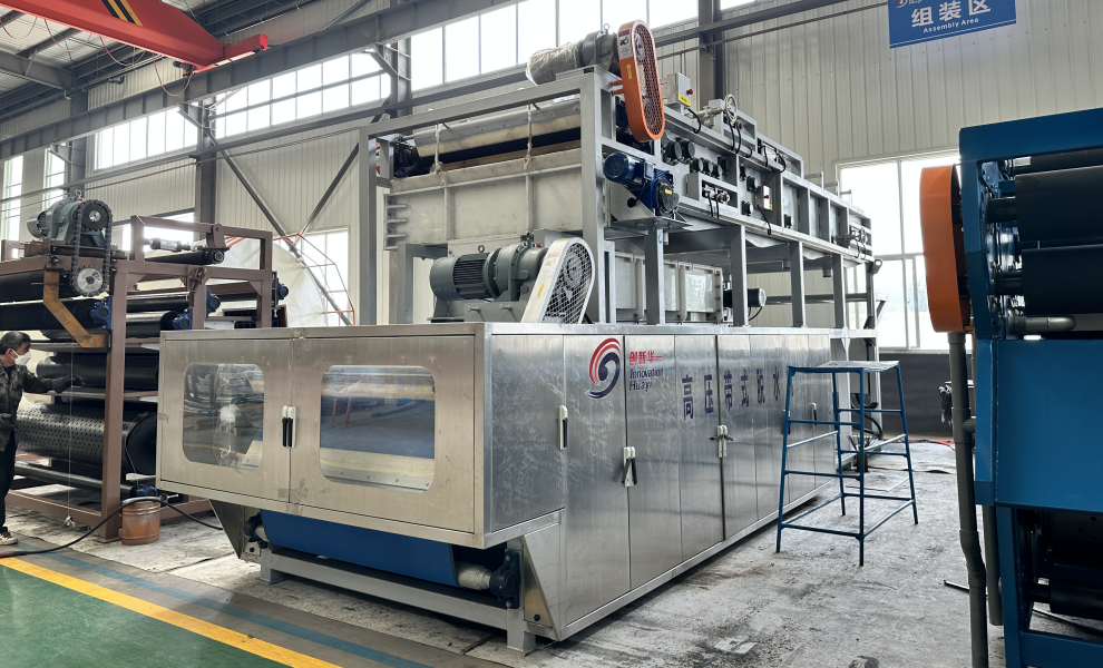 該設(shè)備是我公司在傳統(tǒng)帶式壓濾機(jī)基礎(chǔ)上,研發(fā)生產(chǎn)的全新一代污泥深度脫水機(jī)。設(shè)備增加了液壓裝置、污泥布料裝置,優(yōu)化了調(diào)偏裝置、沖洗裝置和軸承座。新型超高壓帶式污泥脫水機(jī)脫水能力更強,可以在不添加或者少添加輔料的情況下,將污泥含水率降至60%以下。